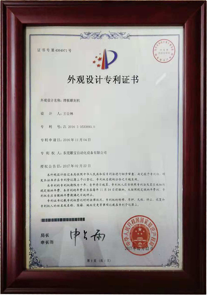 滑板雕刻機專利證書