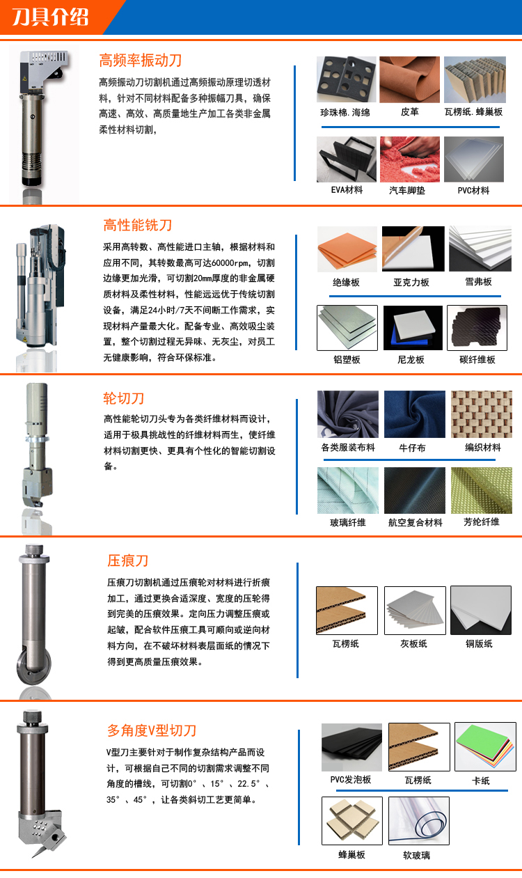 ◆機(jī)器多個(gè)功能頭可選擇:振動(dòng)刀切割頭、壓折線輪和繪圖筆。可切割30mm以下的蜂窩板、瓦楞紙、塑料瓦楞板、灰板紙、白卡紙、膠片、復(fù)合材料、皮料、布料、膠板、珍珠棉和泡沫KT板等多種材料。